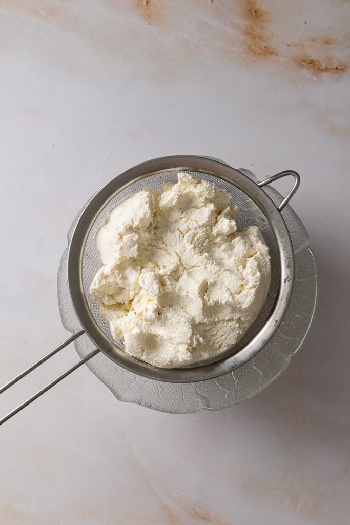 Ricotta in ein feines Sieb geben, dieses über eine Schüssel hängen und im Kühlschrank mindestens 1 Stunde abtropfen lassen.