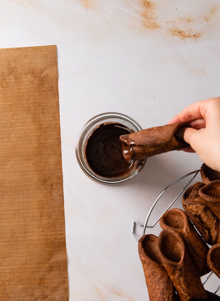 Cannoli vor dem Füllen nach Belieben an den Seiten in etwas flüssige Schokolade tunken. (optional)