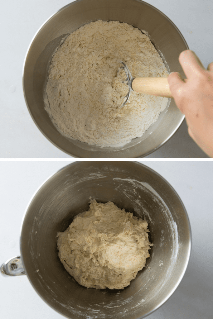 Weizenmehl, Reismehl und Kichererbsenmehl in einer Rührschüssel vermengen. Wasser dazugeben und kurz unterrühren. Teig dann etwa 30 Minuten zur Autolyse stehen lassen. Was ist Autolyse? Durch die Autolyse quellen Stärke und Eiweiß im Mehl auf. Das enthaltene Gluten entwickelt lange Stränge was dem Teig später mehr Struktur verleiht.