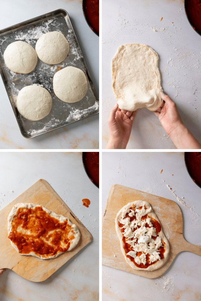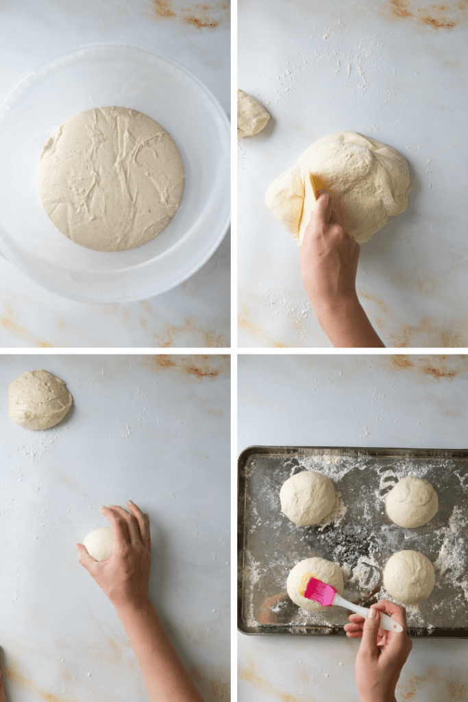 Nach der Rührzeit Teig aus dem Kühlschrank nehmen, in 4-5 gleichmäßige Portionen verteilen (gerne Küchenwaage zur Hand nehmen). Die Teigportionen zu kompakten Kugeln formen, auf ein Blech setzen, mit etwas Öl bepinseln und mit Frischhaltefolie gut zudecken, sodass der Teig nicht austrocknen kann. 4 Stunden aufgehen lassen.
