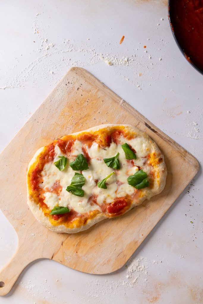 Mehl bereitstellen, Arbeitsfläche mit Mehl bestäuben und die erste Teigportion zu einem länglichen Fladen formen. Er sollte nicht zu dünn sein und einen deutlichen Rand haben. Teigfladen auf eine mit reichlich Mehl oder Hartweizengrieß bestäube Pizzaschaufel oder ein großes Blech legen, wieder in Form ziehen und mit Tomatensauce, Mozzarella und Belag nach Wunsch Belegen.