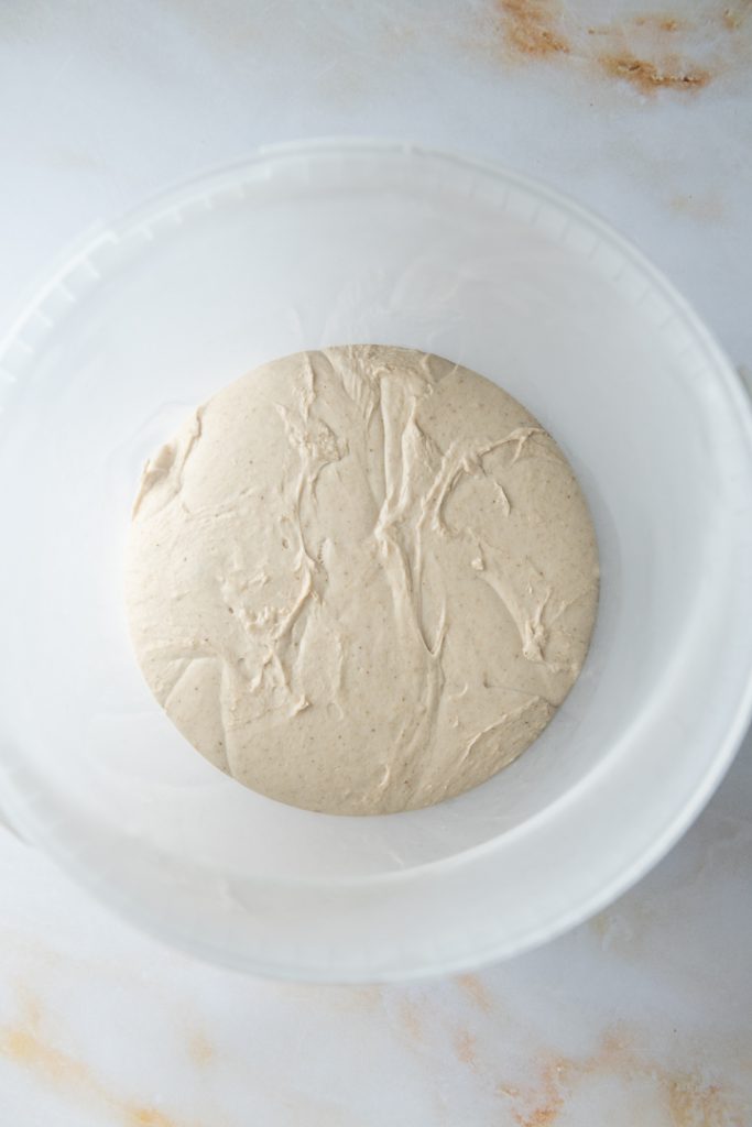 Teig auf der Arbeitsfläche kurz zu einer Kugel formen. Zurück in die Rührschüssel oder ein großes Gefäß mit Deckel geben und bei geschlossenem Deckel zunächst etwa 1 Stunde bei Raumtemperatur und dann für 1-2 Tage im Kühlschrank ruhen lassen.