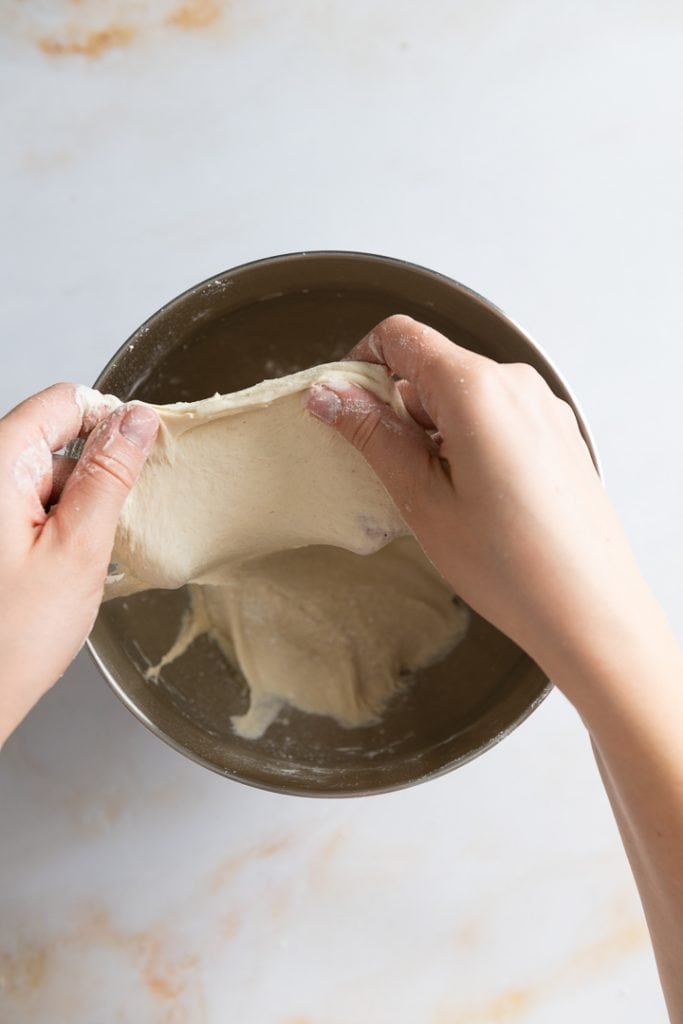 Nach der Autolyse Hefe, Olivenöl und Salz mit in die Schüssel geben und Teig für etwas 10-15 Minuten mit der Küchenmaschine kneten bis ein geschmeidiger Teig entstanden ist, der sich von den Seiten der Rührschüssel löst. Der Teig ist fertig, wenn er den “Fenstertest” besteht. Das heißt, der Teig lässt sich mit den Fingern so dünn ziehen, dass das Licht durchscheint. Variante ohne Lievito Madre: Wenn Du keine Lievito Madre (ein milder italienischer Sauerteig) zur Hand hast kannst Du stattdessen Roggensauerteig verwender oder 1g Hefe extra. So kommst Du dann auf insgesamt 2 g Hefe im Teig.