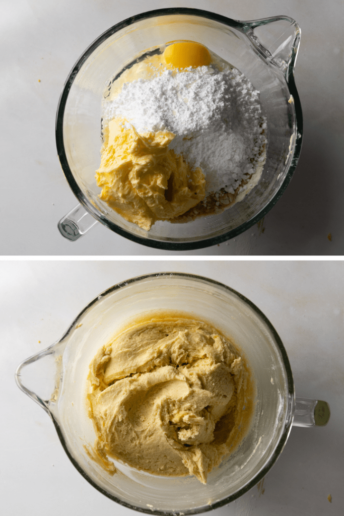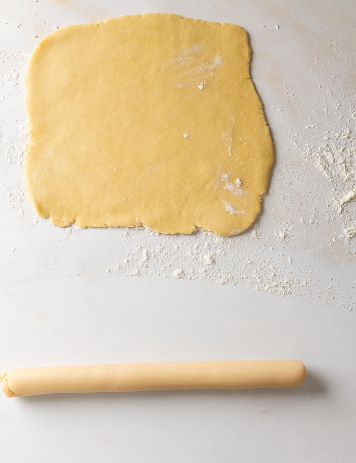 Butter, Puderzucker, Vanilleextrakt und Ei in einer Rührschüssel vermengen. Das Mehl und Salz dazugeben und kurz zu einem geschmeidigen Teig verkneten. Diesen Teig mit etwas Mehl auf der Arbeitsplatte zu einer Kugel formen und zugedeckt mindestens 1 Stunde, besser über Nacht im Kühlschrank ziehen lassen.