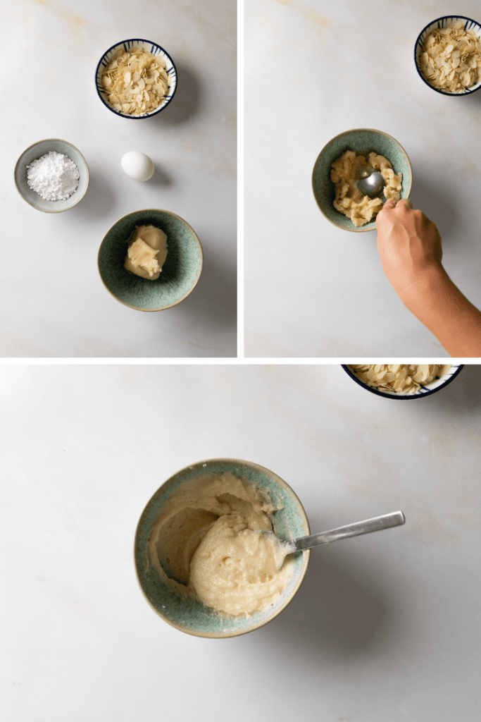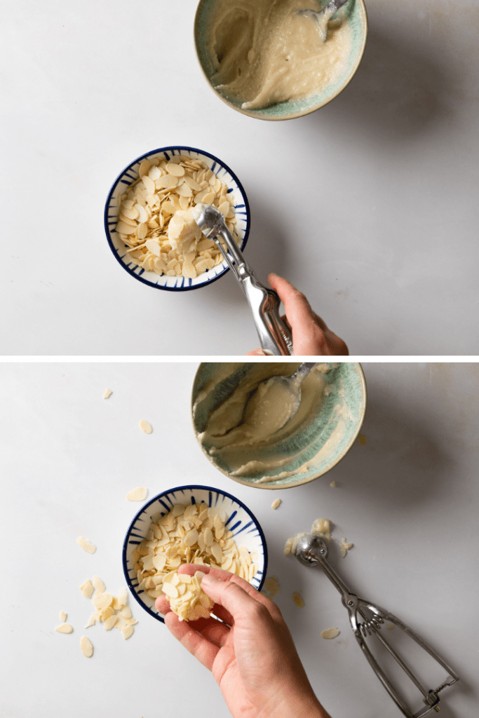 Gib die Mandelblättchen in eine flache Schale. Gib nun etwa walnussgroße Portionen der Marzipanmasse in die Mandelblättchen und rolle die Marizpanmasse in den Mandelblättchen. Wenn das Marzipanbällchen ummantelt ist, setzt du es auf ein Backblech.