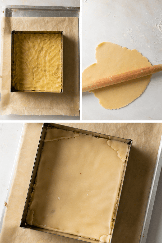 Den Mürbeteig etwas weich kneten, dann auf die Größe der Form ausrollen. Teig am Boden der Form festdrücken. Das Marzipan ebenfalls auf die passende Größe ausrollen. Wenn es sehr klebt, mit etwas Puderzucker arbeiten. Marzipan auf den Mürbeteig legen.