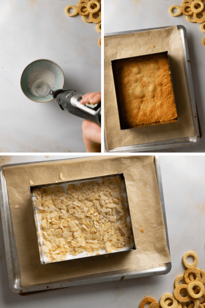 Marzipan- und Mürbeteig im vorgeheizten Backofen 10 Minuten backen. Währenddessen das Eiweiß mit Puderzucker steif aufschlagen. Nach 10 Minuten Backzeit den steifen Eischnee auf dem Marzipan verteilen. Mit Mandelblätten bestreuen und nochmal 5 Minuten backen.