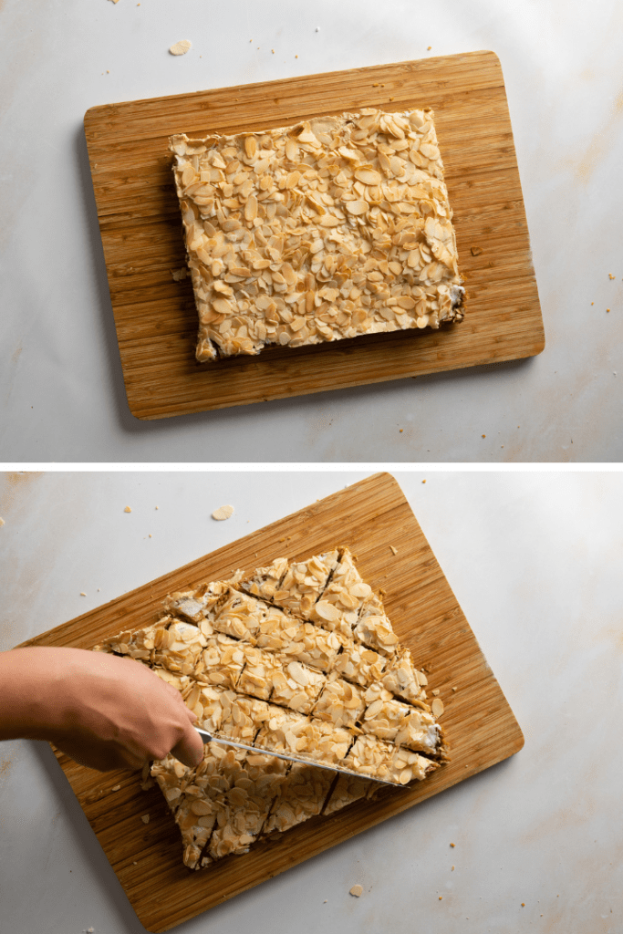 Plätzchen etwas abkühlen lassen, den Backrahmen entfernen und solange die Plätzchen lauwarm sind, in Rauten schneiden. Abkühlen lassen und vorsichtig in eine Keksdose umfüllen.