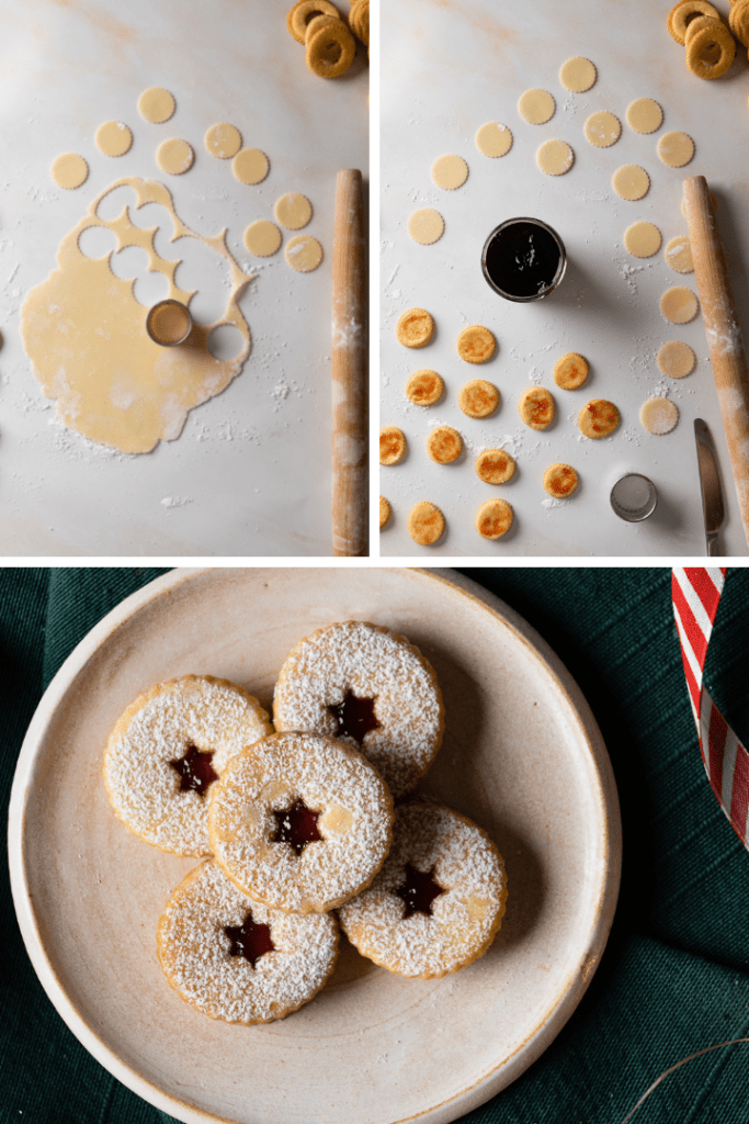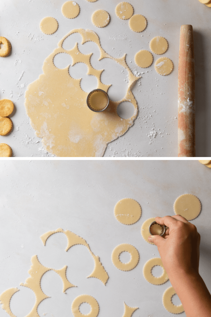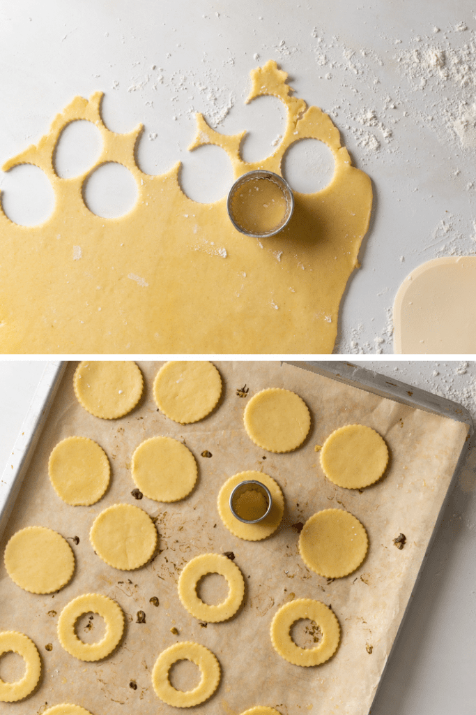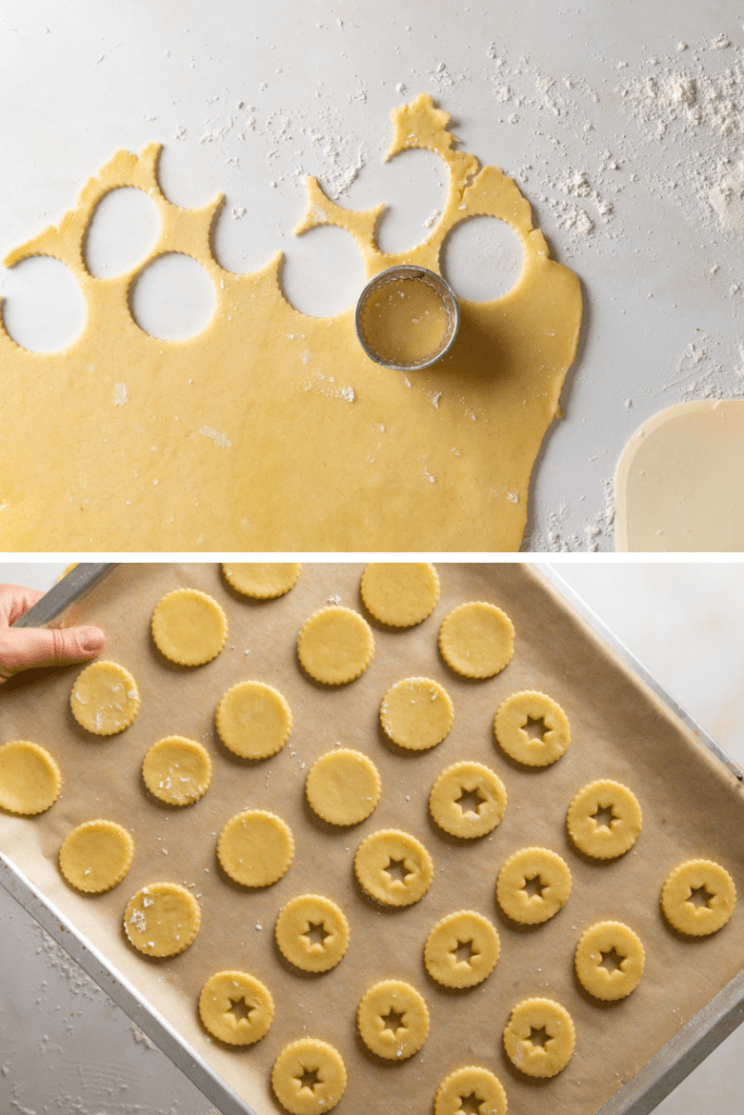 Mürbeteig mit etwas Mehl ca. 2 mm dick ausrollen. Runde Plätzchen mit etwa 3 cm Durchmesser daraus ausstechen. Aus der Hälfte der Plätzchen einen Stern, Kreis oder Herz ausstechen. Auf ein Backblech setzen und im vorgeheizten Backofen ca. 10 Minuten backen bis die Plätzchen an den Rändern goldgelb werden.