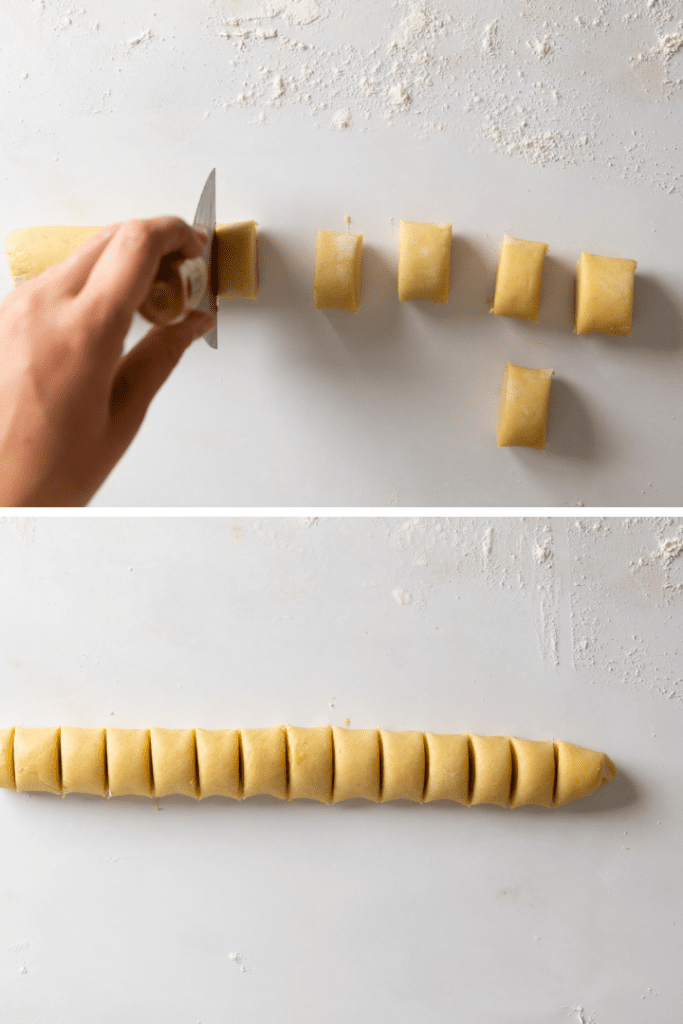 Die Marzipan-Teigstränge dann in ca. 2 cm große Stücke unterteilen. Diese mit etwas Abstand auf ein Backblech setzen. Im vorgeheizten Backofen ca. 10 Minuten backen, bis die Plätzchen beginnen, goldbraun zu werden.