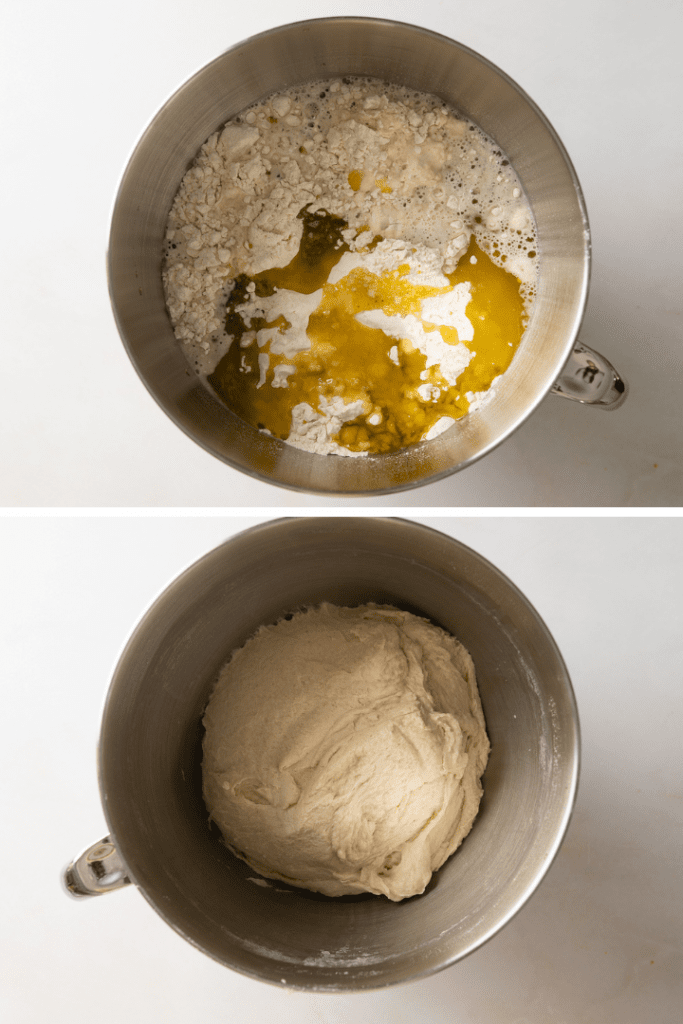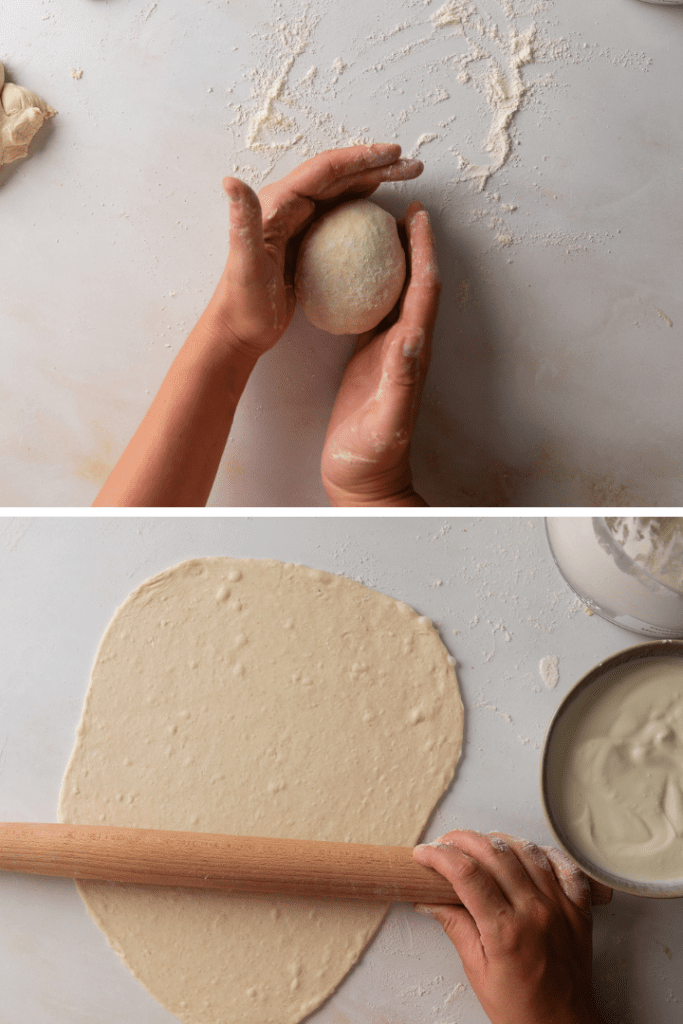 Für den Teig Mehl, Wasser, Pflanzenöl und Salz zu einem geschmeidigen Teig verkneten. 20 Minuten ruhen lassen.