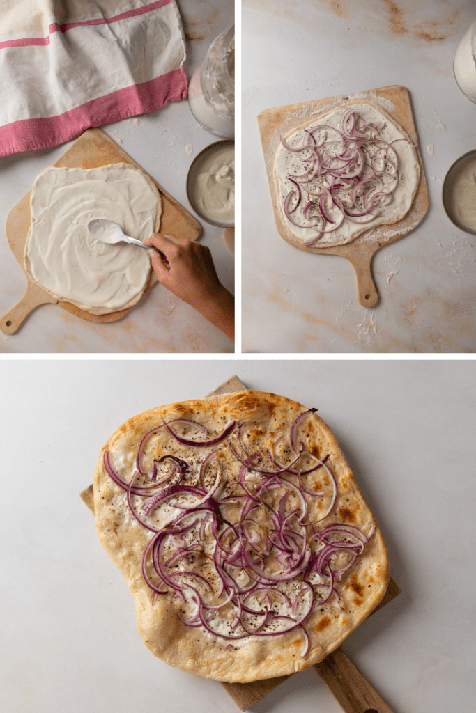 Um den Flammkuchen sicher in den Ofen zu bekommen empfehle ich, ein großes Brett zu verwenden und etwas Grieß darauf zu streuen. Der Grieß wirkt wie winzig kleine Rollen und sorgt dafür, dass der Flammkuchen problemlos vom Brett aufs Backblech gleitet. Flammkuchen im heißen Backofen etwa 3-5 Minuten backen, bis er goldbraun ist.