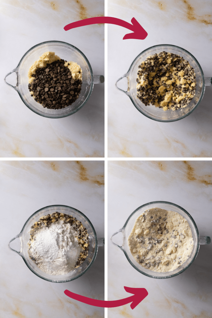 Gib nun die Schokoladenchips dazu und rühre erneut für etwa 30 Sekunden, bis die Zutaten gut vermengt sind. Siebe Mehl, Salz, Natron und Backpulver dazu und rühre erneut für etwa 1 Minute, bis die Mischung eine sandige, semmelbröselartige Konsistenz hat.