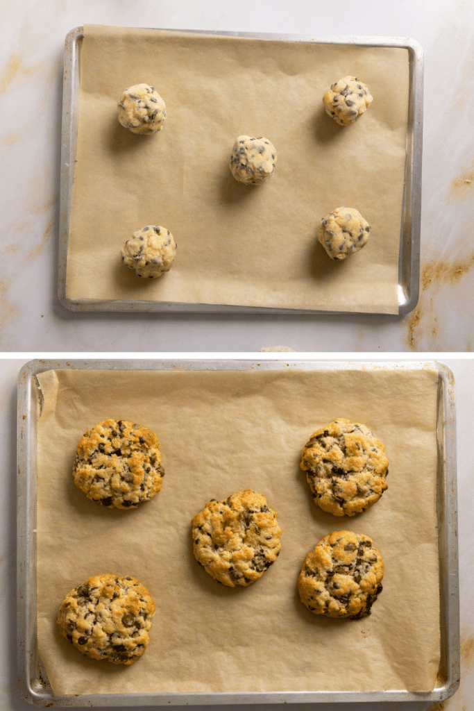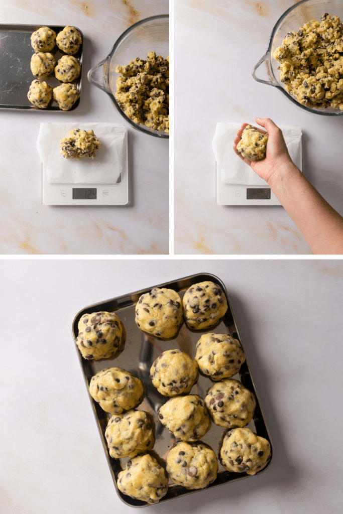 Wiege nun jeweils 100 - 125 g des Teiges ab und drücke den Teig zwischen den Händen zu einer groben Kugel zusammen. Erneut wird nicht geknetet, sondern der Teig nur komprimiert. Gib die Teigkugeln dann in einen Plastikbehälter oder auf ein kleines Blech und friere sie für mindestens 8 Stunden ein. Nur durch diese Kühlzeit erhalten die Kekse ihre typische Konsistenz.