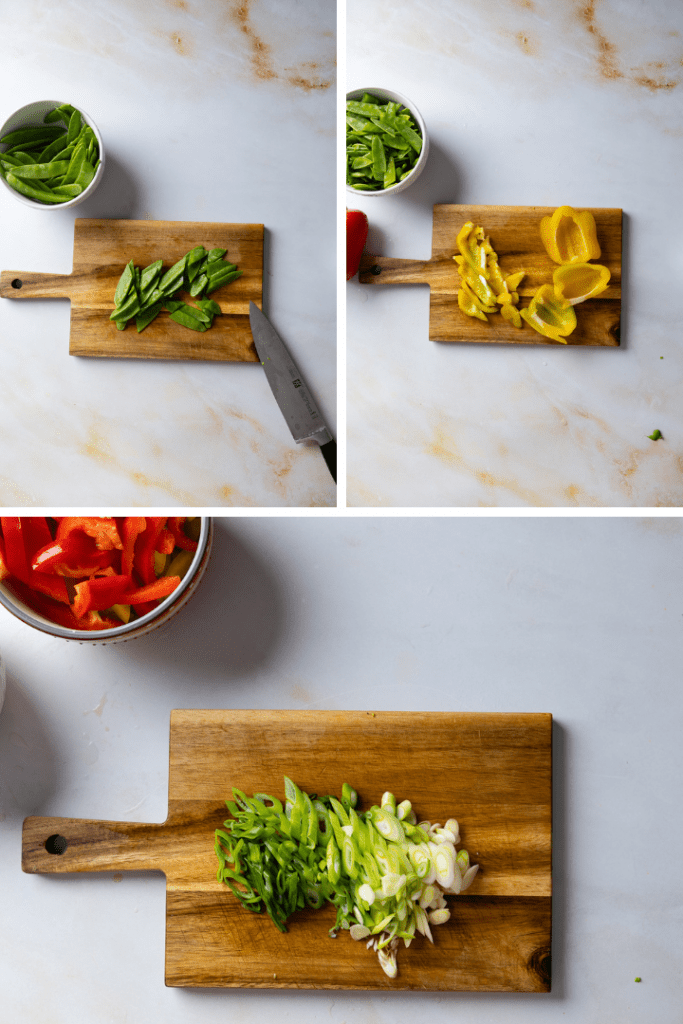 In einem großen Topf Wasser für die Nudeln zum kochen bringen. Derweil Gemüse Waschen und schneiden. Die Zuckerschoten dritteln, Paprika in mundgerechte Stücke schneiden. Tofu in ca. 1 cm große Würfel schneiden. Knoblauch fein hacken, Frühlingszwiebel in feine Ringe schneiden.
