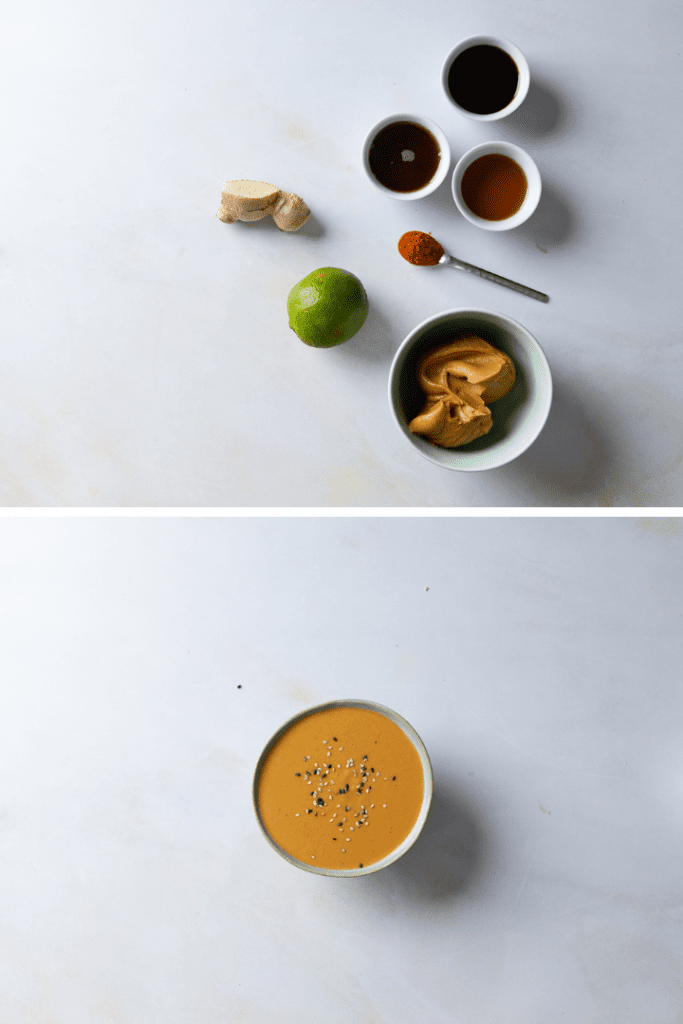 Für die Erdnusssoße, Ingwer fein reiben, zusammen mit den anderen Zutaten in eine Schüssel geben und mit einem Schneebesen zu einer glatten Soße verrühren. Abschmecken und je nach Bedarf mehr Sojasauce oder Limettensaft zufügen. Soße in Portionsschälchen abfüllen und zum Servieren bereit halten.