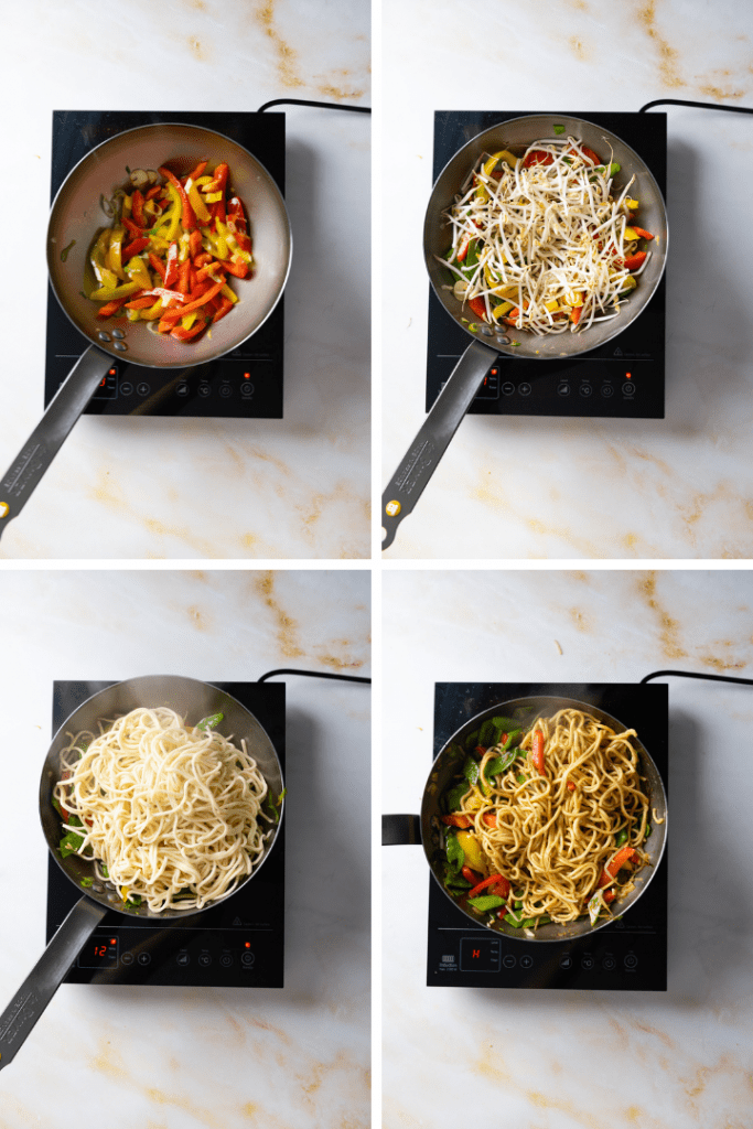 Nudeln nach Packungsangabe kochen. Sobald die Nudeln im Wasser sind, In einer Pfanne oder einem Wok Pflanzenöl erwärmen. Knoblauch und den weißen Teil der Frühlingszwiebeln hinzugeben, kurz anbraten, dann Zuckerschoten zufügen und Paprika. Kurz scharf anbraten, Sprossen hinzufügen und die abgegossenen Nudeln. Nun kräftig anbraten. Sojasauce, Sesamöl und Limettensaft zufügen und nochmals kurz scharf anbraten.