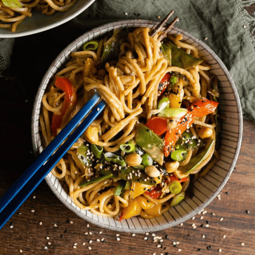 Da gebratene Nudeln immer frisch zubereitet am besten schmecken, solltest Du sie erst dann zubereiten, wenn Du auch essen möchtest. Du kannst jedoch die Erdnusssoße bereits mehrere Tage im Voraus zubereiten und für 3-4 Tage im Kühlschrank lagern. Auch das Gemüse kannst Du bereits im Voraus schneiden und musst dann später nur noch die Nudeln kochen und alle in Pfanne oder Wok zubereiten.