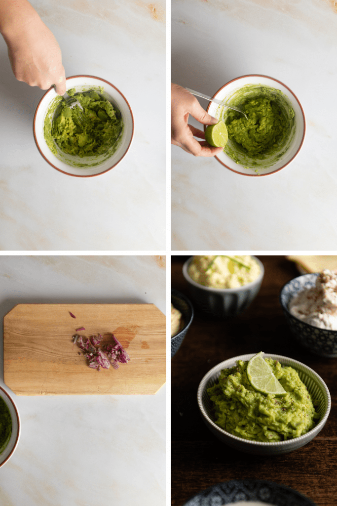 Avocado längs halbieren, Kern entfernen und das Fruchtfleisch auslöffeln. In einen Schüssel geben und mit einer Gabel zerdrücken. Limettensaft, Salz und Pfeffer dazugeben. Wer mag, fügt noch eine fein gehackte Schalotte oder rote Zwiebel hinzu.