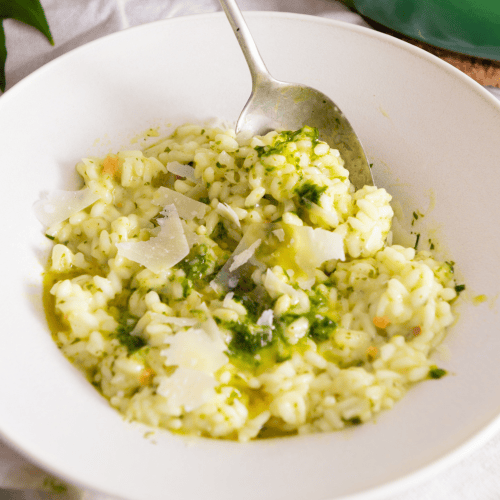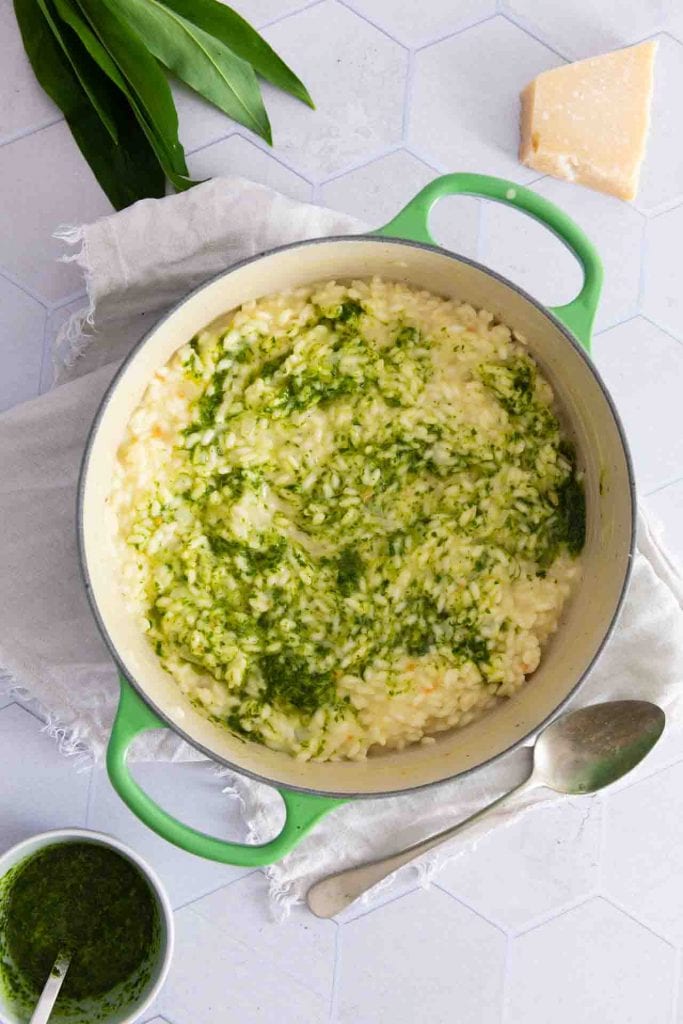 Serviere das Risotto mit dem Bärlauchpesto. Du kannst es entweder komplett unter das Risotto rühren oder separat servieren, sodass jede Person am Tisch selbst bestimmen kann, wie viel Bärlauchpesto sie im Risotto haben möchte.