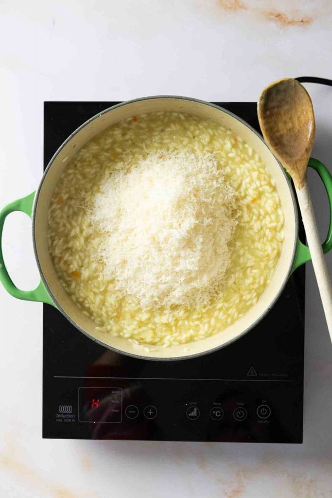 Füge nun den Parmesan hinzu. Rühre ihn unter und schmecke das Risotto mit Salz und Pfeffer ab.