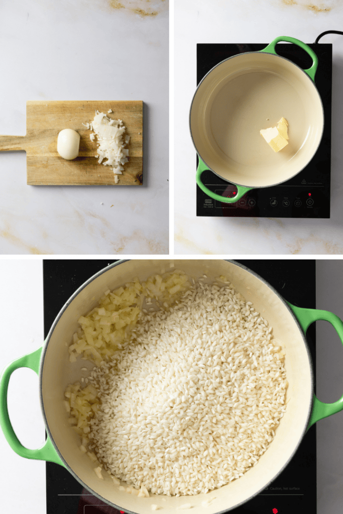 Hacke die Zwiebel sehr fein und brate sie in einem Topf mit der Butter glasig an. Füge dann den Risottoreis hinzu. Gare den Reis kurz, bis die Körner beginnen durchsichtig zu werden.