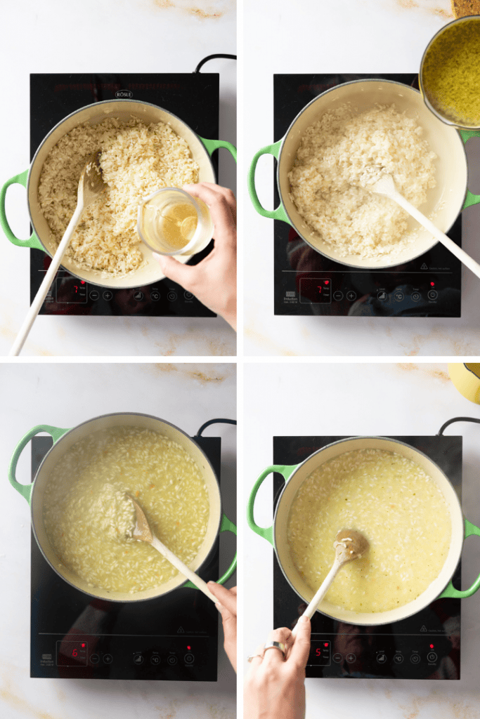 Gib dann den Weißwein hinzu und lass ihn bei ständigem Rühren verkochen. Füge dann Schöpflöffelweise die Gemüsebrühe hinzu. Rühre dabei ständig und gib den nächsten Löffel Brühe erst hinzu, wenn die Brühe vom Reis aufgesaugt ist. Nach 20-30 Minuten sollte der Reis gar sein.