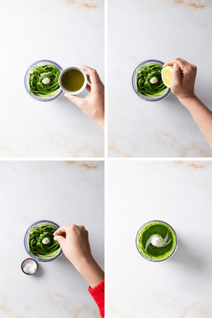 Mixe Olivenöl, Bärlauch, Zitronensaft sowie eine Prise Salz und Pfeffer in einem Mixer zu einem glatten Pesto.