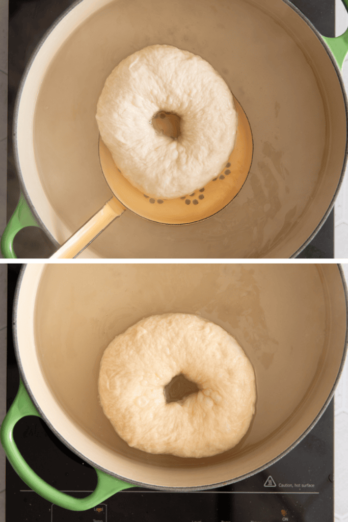 Die fertig geformten Bagels nach und nach im kochenden Wasser brühen. Bagels dafür in das heiße Wasser gleiten lassen. Zwei Minuten brühen, anschließend vorsichtig umdrehen und auf der anderen Seite weitere zwei Minuten brühen.