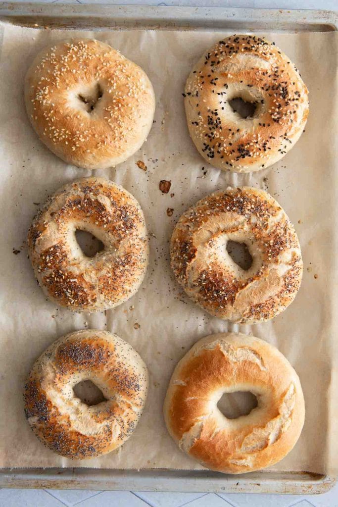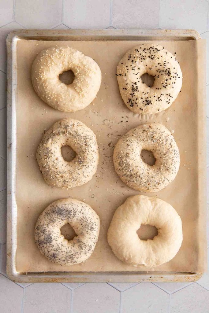 Die gebrühten Bagels mit einem Topping deiner Wahl bestreuen. Bagels dann auf das Backblech setzen und im heißen Backofen bei 200 °C Ober- und Unterhitze für ca. 20 Minuten backen. Nach 20 Minuten die Ofentemperatur auf 250 °C erhöhen und weitere 5 Minuten Backen (ab dem Zeitpunkt der Temperaturänderung) sodass die Bagels insgesamt 25 Minuten backen und schön goldbraun werden.