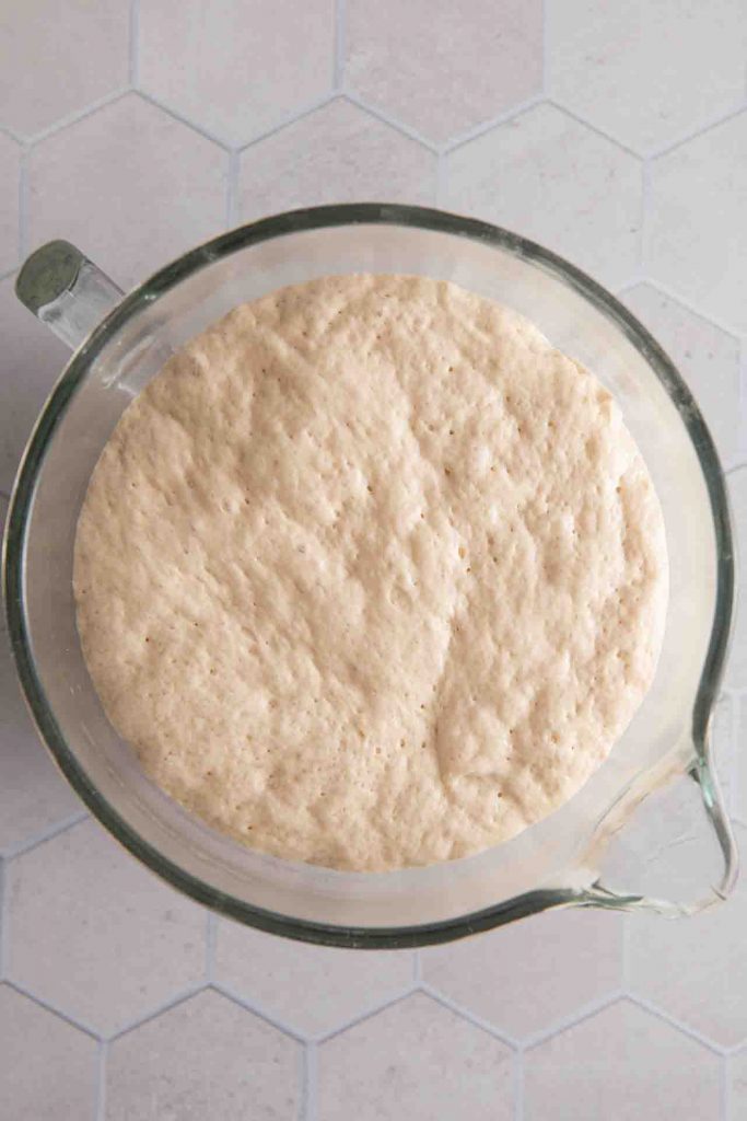 Den Teig abgedeckt an einem warmen Ort für ca. 1 Stunde aufgehen lassen, bis sich das Volumen mindestens verdoppelt hat. Alternativ kann der Teig auch über Nacht im Kühlschrank aufgehen.