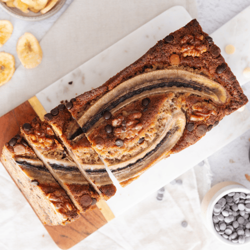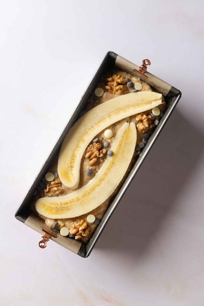 Teig in die vorbereitete Form füllen und mit Banane, Schokochips und Walnüssen dekorieren.