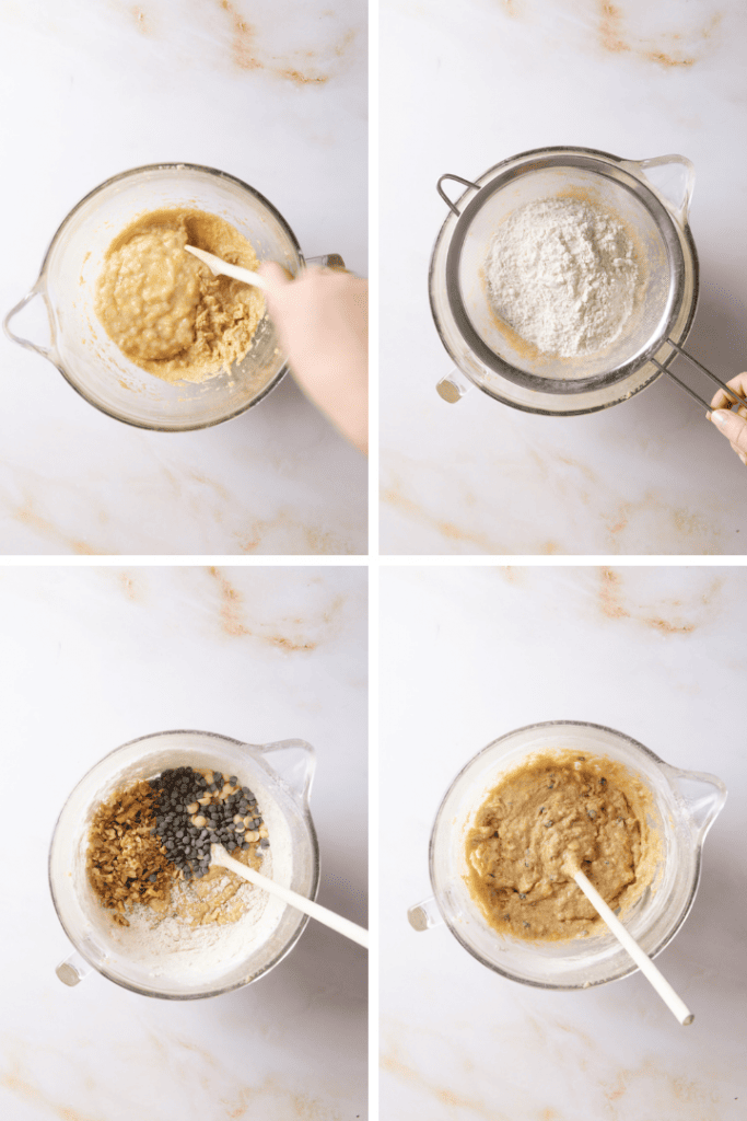 Zerdrückte Banane, trockene Zutaten sowie Walnüsse und Schokochips untermischen und kurz zu eine glatten Teig verrühren.