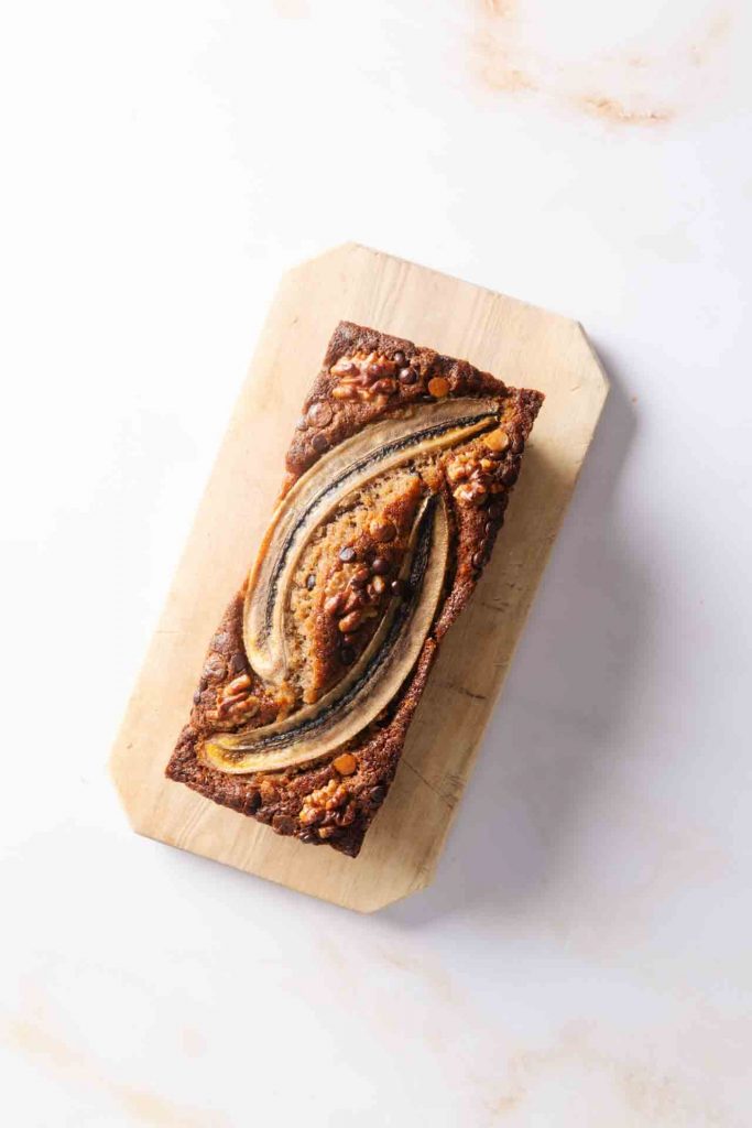 Banana Bread bei 170 °C für ca. 60 Minuten backen. Mit der Stäbchenprobe kontrollieren ob der Kuchen gar ist und auf einem Gitter auskühlen lassen.