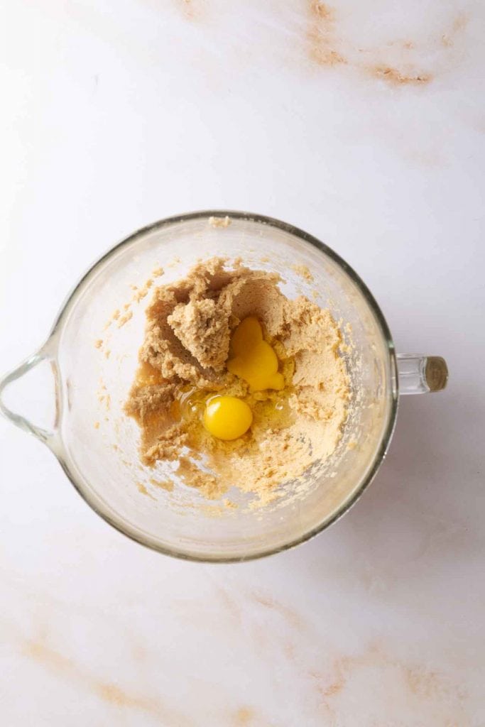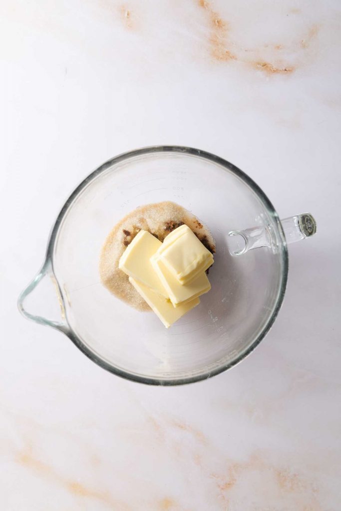 Die weiche Butter mit dem brauen Zucker und dem dunkeln weichen braunen Zucker circa 2 Minuten lang mit der Küchenmaschine oder dem Handrührgerät schaumig schlagen.