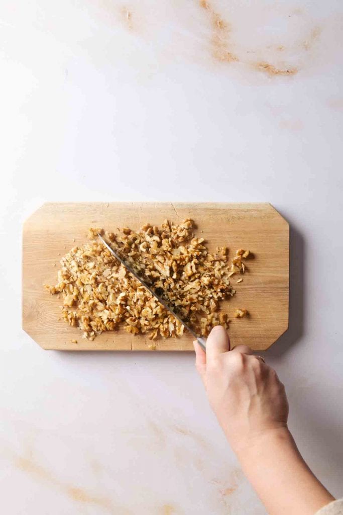 Weiße und dunkle Kuvertüre und die Walnüsse auf einem Brettchen grob hacken und zur Seite stellen.