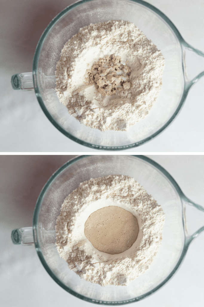 Mehl in eine große Schüssel sieben und in der Mitte eine Mulde formen. Hefe und 1 TL Zucker in die Mulde bröseln und zusammen mit ca. 4 EL lauwarmer Milch einen Vorteig anrühren und diesen ca. 10 Minuten an einem warmen Ort gehen lassen.