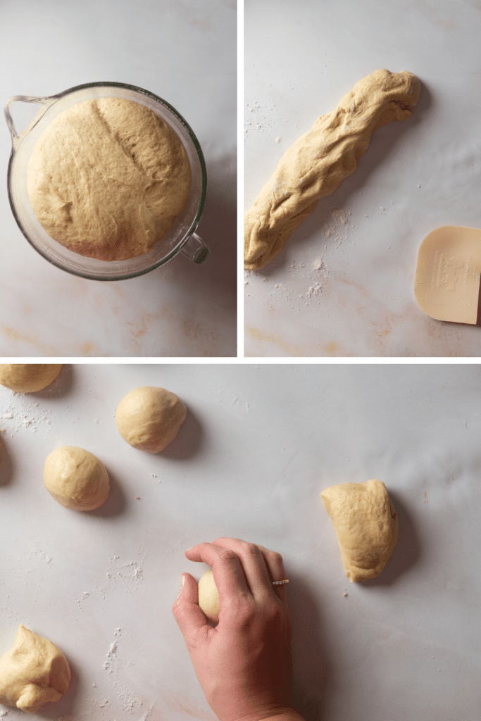 Teig in 10-12 gleich große Teile aufteilen und diese auf einem Holzbrett und mit einem Tuch abgedeckt weitere 15 Minuten gehen lassen. Die Zwetschgen entsteinen bzw. Äpfel in mundgerechte Würfel schneiden und mit Zimt vermengen. Die Auflaufform mit Butter gut Einfetten.