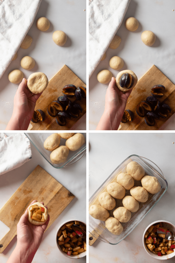 Die einzelnen Teigkugeln platt drücken und je mit 1 Zwetschge oder 1 EL Apfelfüllung füllen. Teig um die Füllung herum verschließen und wieder zu Kugeln formen. Diese nebeneinander in die Auflaufform setzen. Es muss kein Platz zwischen den einzelnen Rohrnudeln gelassen werden. Rohrnudeln erneut 30 Minuten zugedeckt an einem warmen Ort aufgehen lassen.