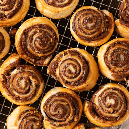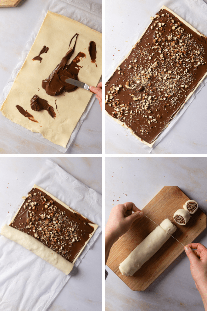 Heize den Backofen auf 170 °C Ober- und Unterhitze vor und lege ein Backblech mit Backpapier aus. Entrolle der Blätterteig und bestreiche ihn gleichmäßig mit Nuss Nougat Creme und streue dann die Nüsse darauf. Rolle den Blätterteig nun wieder eng auf und zerteile den Teigstrang in 2 cm dicke Scheiben. Besonders gut geht das mit einem Stück Bindfaden, den du in einer Schlinge an der gewünschten Stelle um den Teigstrang legst und dann zu ziehst. Mein Tipp: Verwende ganze Haselnüsse und hacke die Nüsse mit einem Messer in mittelgroße Stücke. Aroma und Qualität sind immer besser, wenn du mit ganzen Nüssen arbeitest.