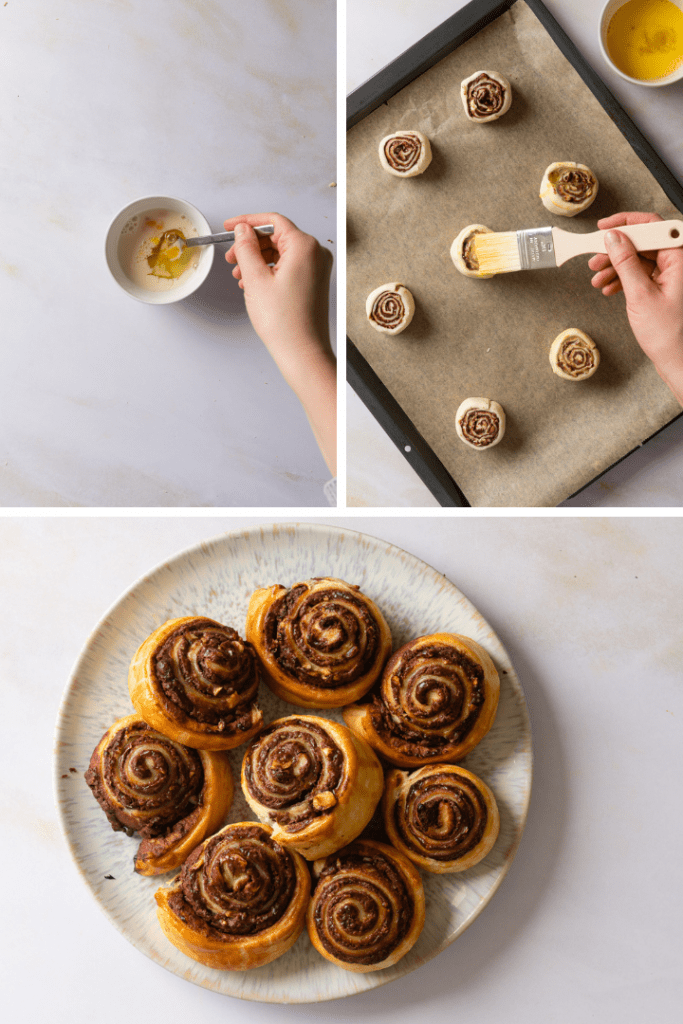 Vermenge das Ei mit der Milch und bestreiche die Nutella Blätterteigschnecken damit. Backe sie nun im vorgeheizten Backofen bei 170 °C Ober- und Unterhitze für etwa 20 Minuten, bis sie goldbraun sind.