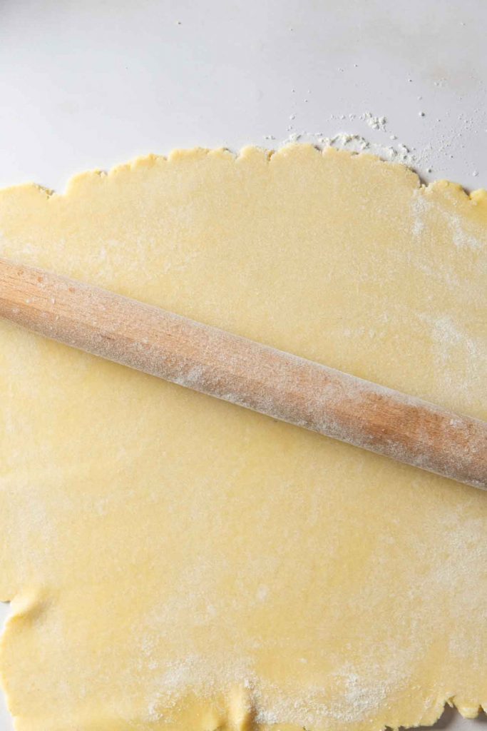 Heize den Backofen auf 170 °C Ober- und Unterhitze vor. Rolle den Teig mit etwas Mehl ca. 3-5 mm dick aus, sodass er den Boden und den Rand einer Springform mit 26 cm Durchmesser bedeckt.
