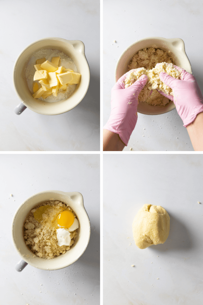 Gib Butter, Zucker und Mehl in eine Schüssel und zerreibe die Zutaten zwischen den Fingern bis sie die Konsistenz von feuchtem Sand haben. Knete dann Quark, Eier und Salz unter, sodass ein geschmeidiger Teig entsteht. Decke den Teig ab und lass ihn für mindestens eine Stunde im Kühlschrank ruhen.