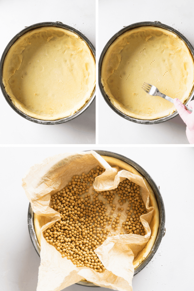 Lege den Teig dann in die Form, die du vorher mit etwas Butter ausgepinselt hast. Stich den Boden mit einer Gabel mehrfach ein. Lege ein Stück Backpapier darauf und beschwere es mit getrockneten Erbsen oder Backgewichten. Backe den Boden so im vorgeheizten Backofen bei 170 °C Ober- und Unterhitze für 25 Minuten.