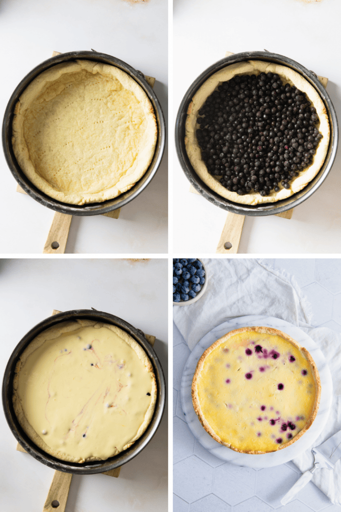 Entferne Backgewichte und Backpapier. Gib die Heidelbeeren auf den Boden. Vermenge Eier, Zucker, Quark, Schmand, Vanillepudding und Vanilleextrakt sowie Weizenmehl mit Saft und Abrieb der Zitrone und fülle die Schmand Mischung auf die Heidelbeeren.
