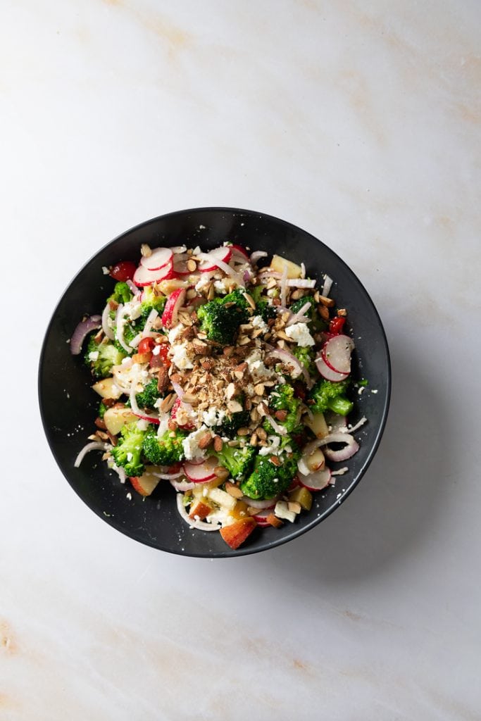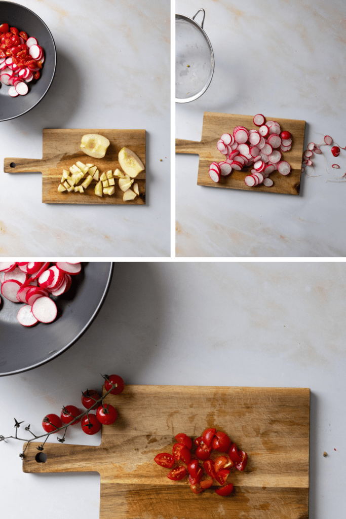 Brokkoli zusammen mit Apfel, Radieschen, Zwiebel und Tomaten in eine große Schüssel geben.