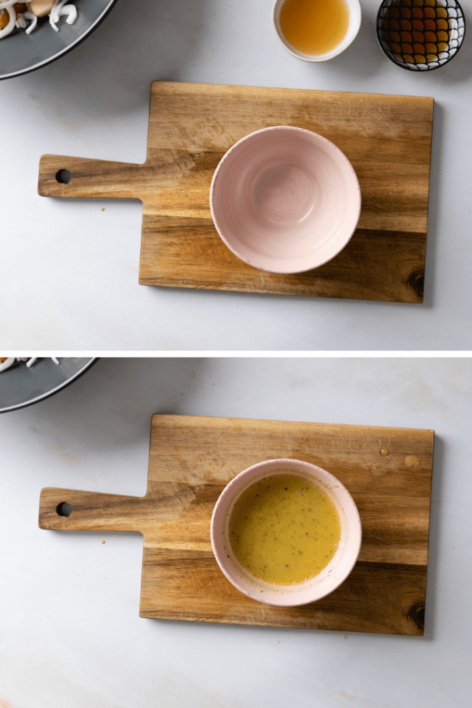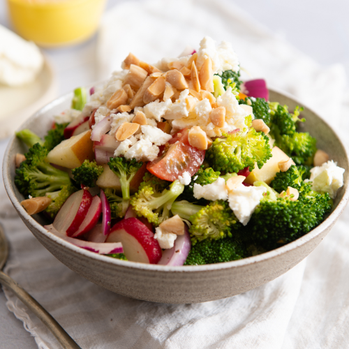 In einer separaten Schüssel die Zutaten für das Dressing vermengen und zu einem cremigen Dressing verrühren. Dressing über den Brokkoli Salat geben, einmal gut durchmischen.