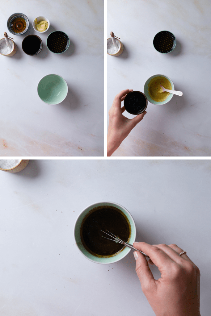 Für das Dressing alle Zutaten in eine kleine Schüssel geben und mit einem kleinen Schneebesen kräftig verrühren. Alternativ in einem sauberen Marmeladenglas zubereiten. Einfach den Deckel darauf setzen und kräftig schütteln, schon ist das cremige Dressing fertig.