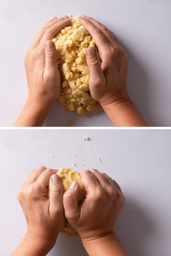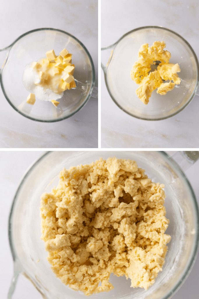 Butter, Zucker, Vanilleextrakt und Salz in eine große Rührschüssel geben. Kurz vermengen, bis sich Butter und Zucker grob verbunden haben. Mehl hinzufügen und kurz unterrühren.