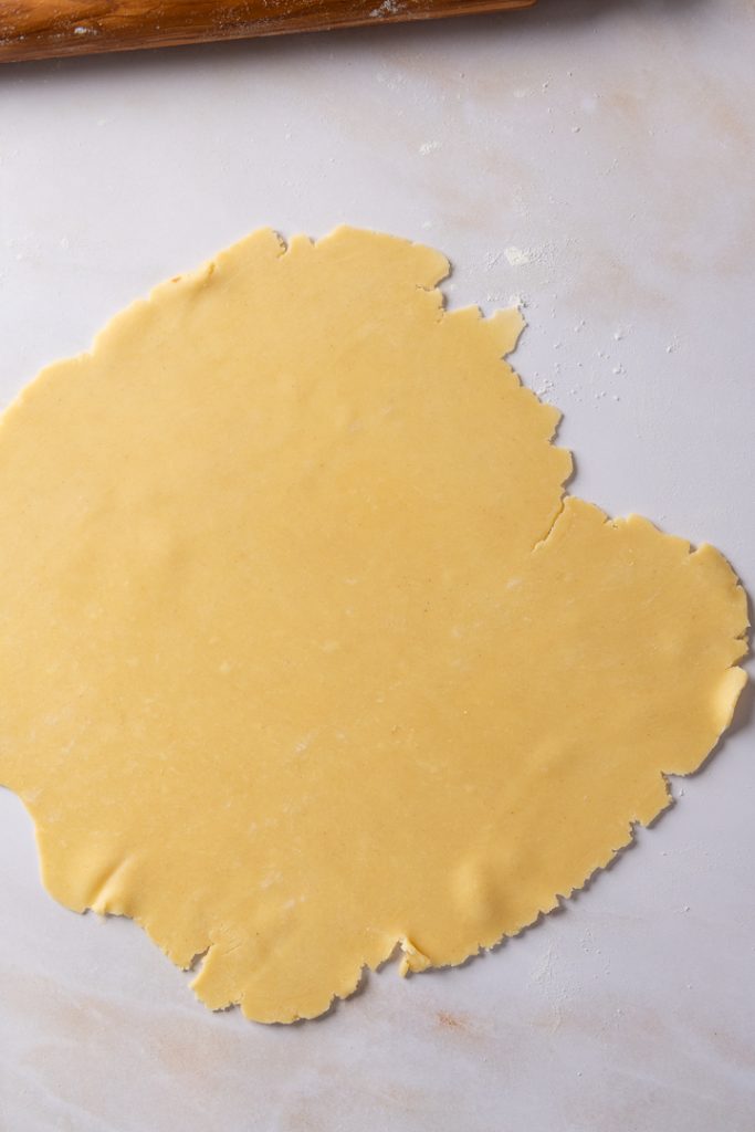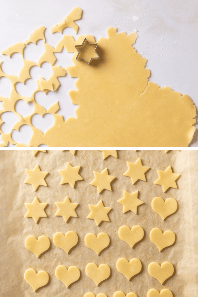 Heize den Backofen auf 170 °C Ober- und Unterhitze vor und belege einige Backbleche mit Backpapier. Knete den Teig kurz geschmeidig und rolle ihn mit Hilfe von etwas Mehl ca. 3 mm dick aus.